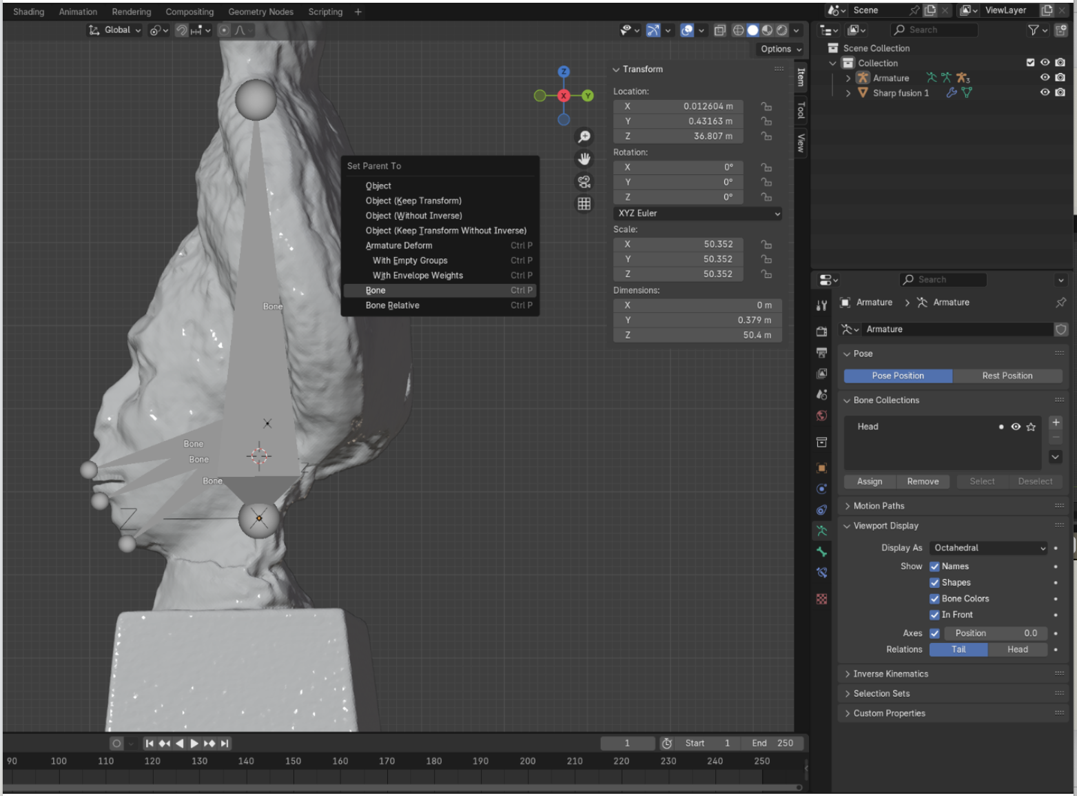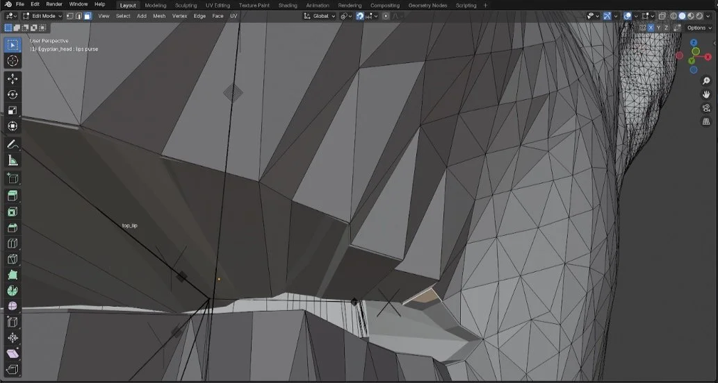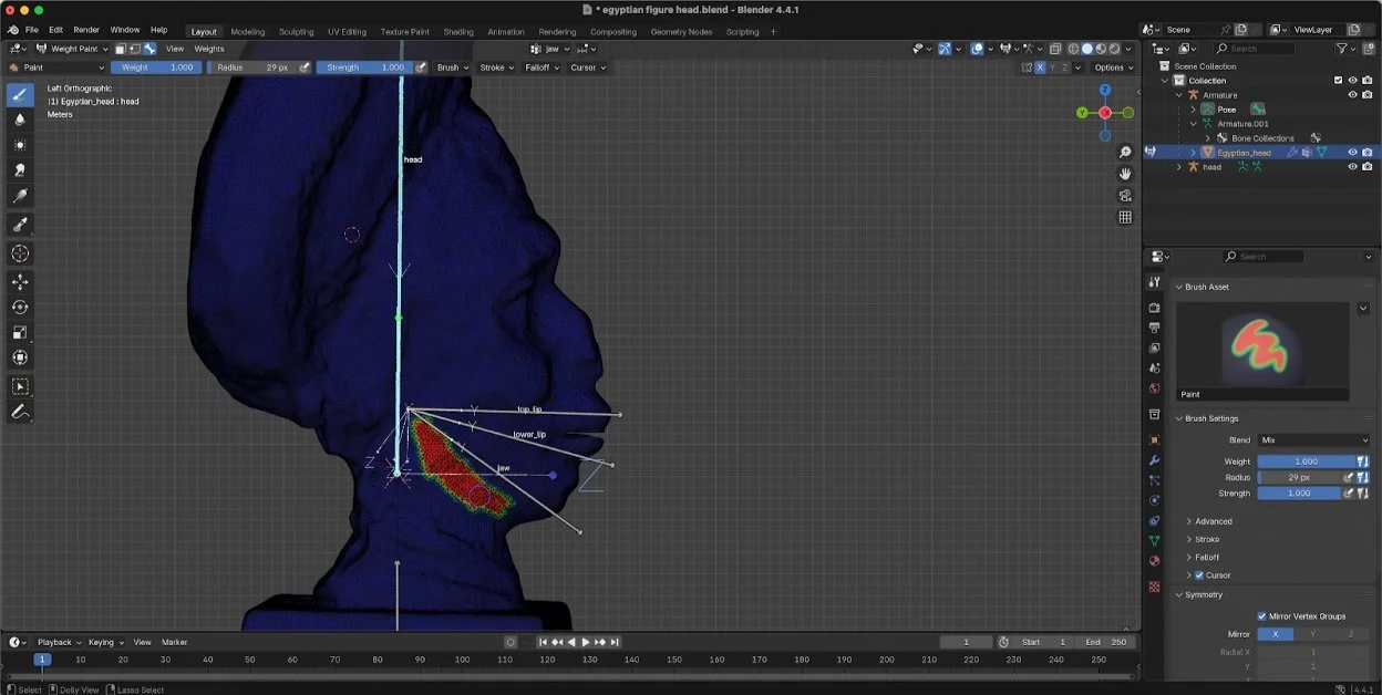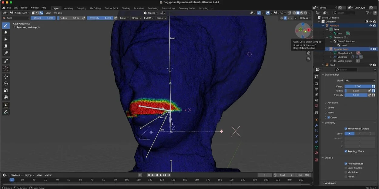 Rigging in Blender, required preparing the digital surrogates for animation by rigging the lips and mouth to ensure that voice narration by professionals in egyptology and language specialists can be performed.